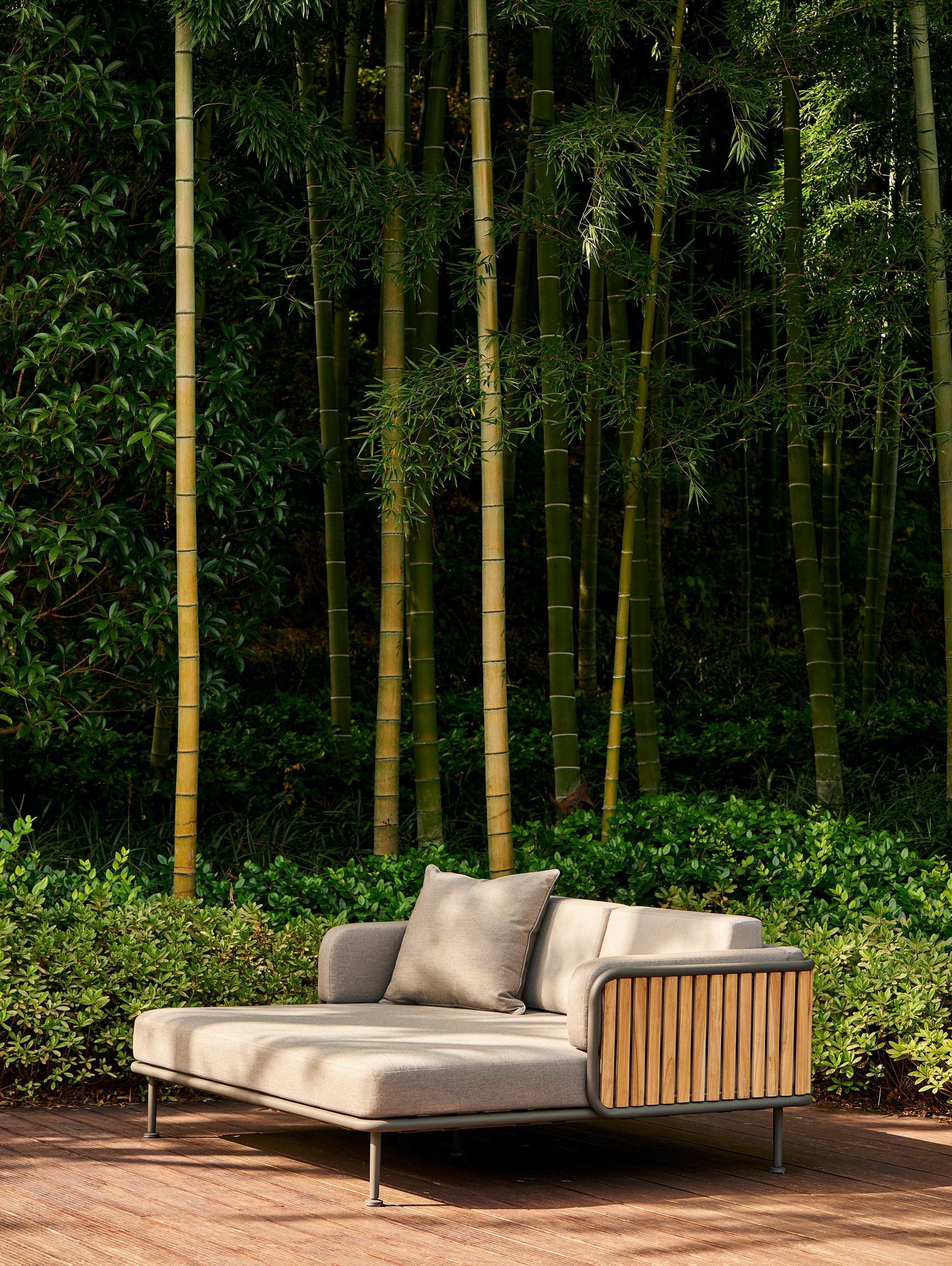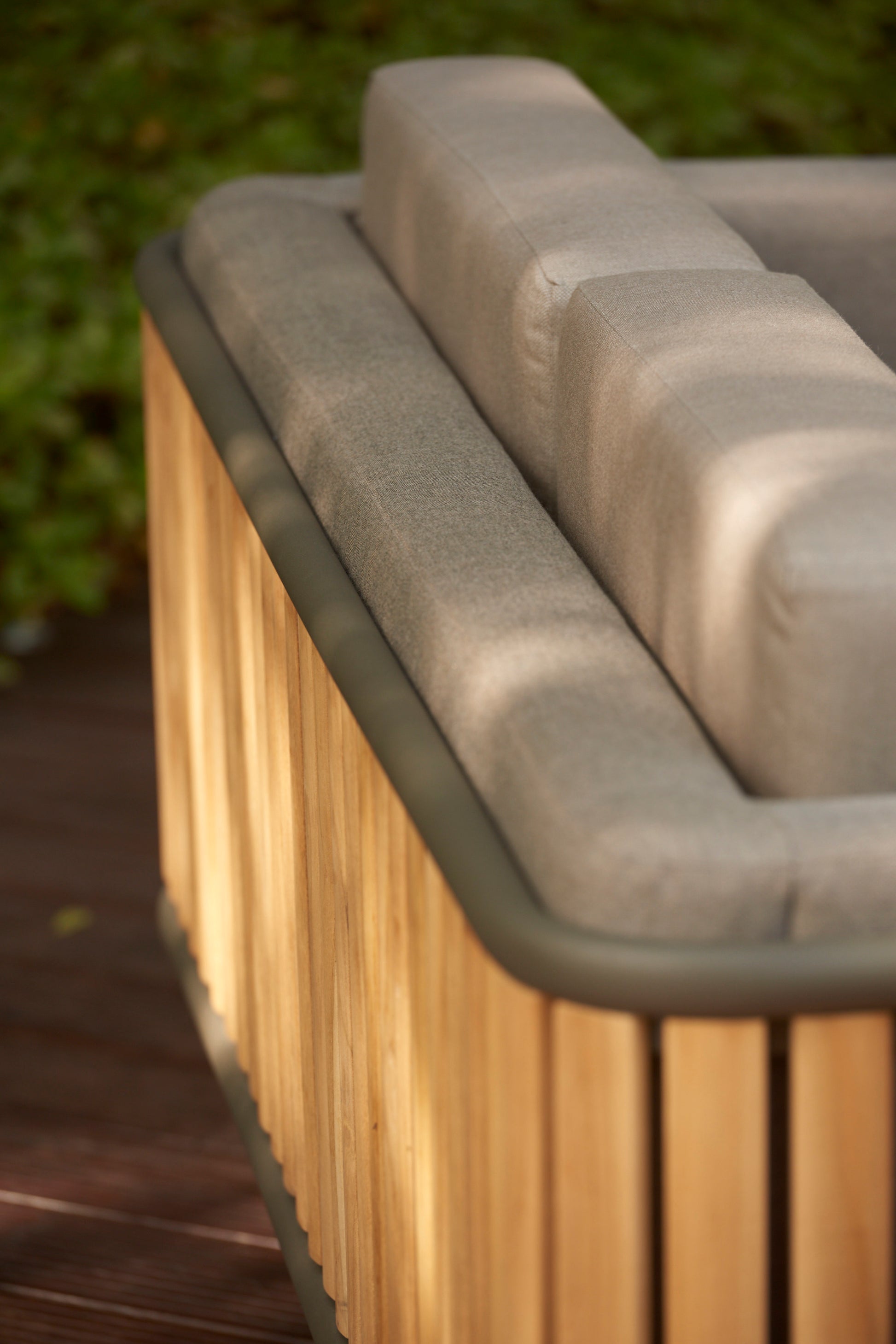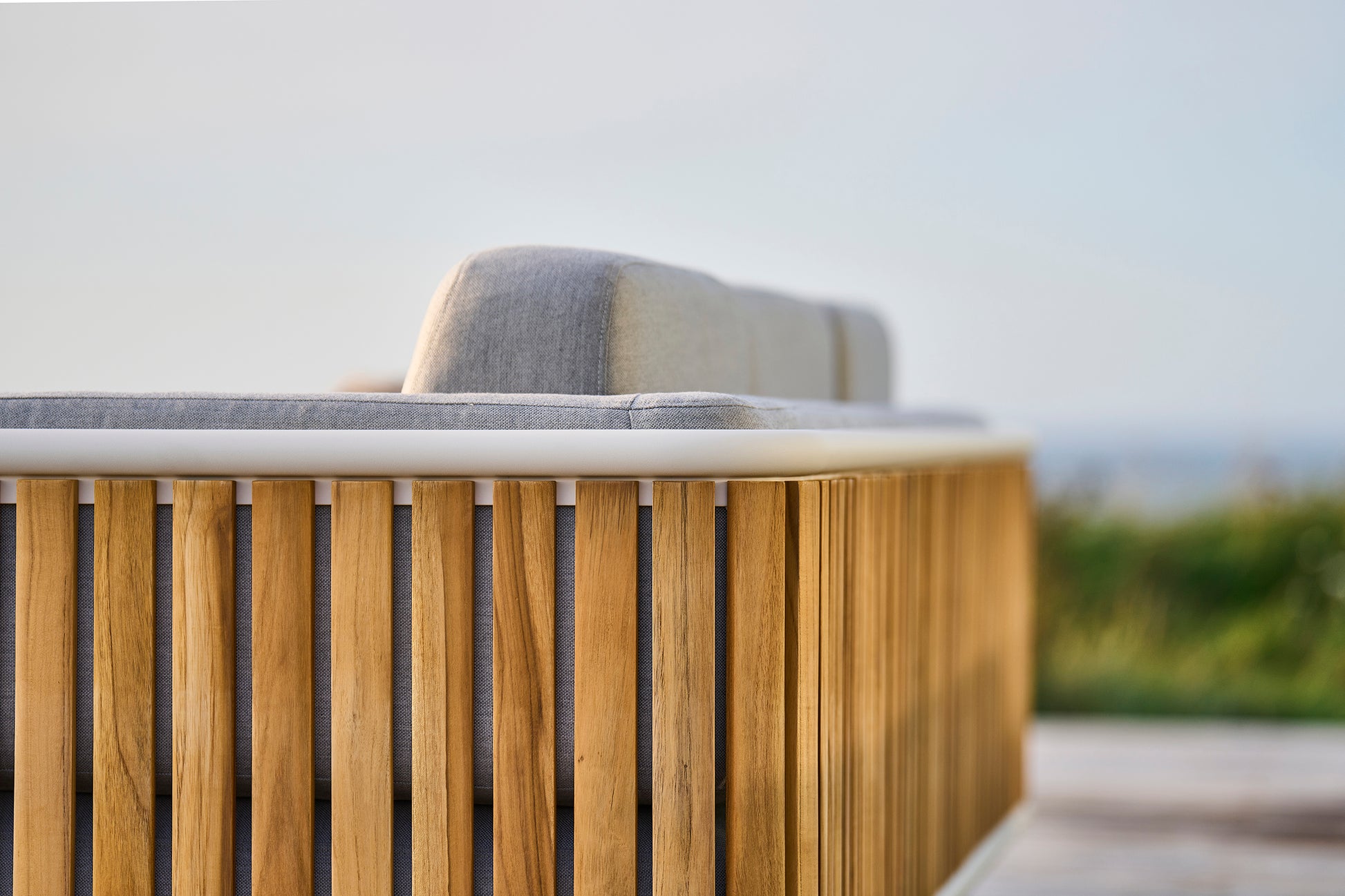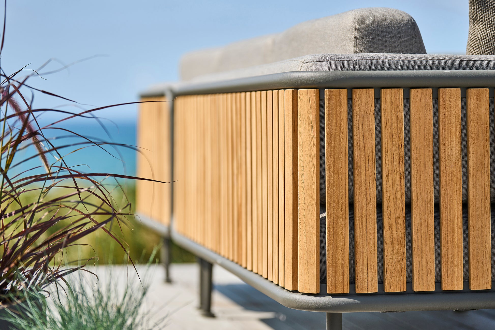 El sofá de exterior MINDO 100 combina diseño modular, materiales de alta calidad y una comodidad excepcional para transformar cualquier espacio al aire libre en un refugio de relax y estilo. Su estructura de aluminio resistente, combinada con laterales de teca certificada, aporta un acabado cálido y sofisticado, ideal para jardines, terrazas y zonas de piscina.