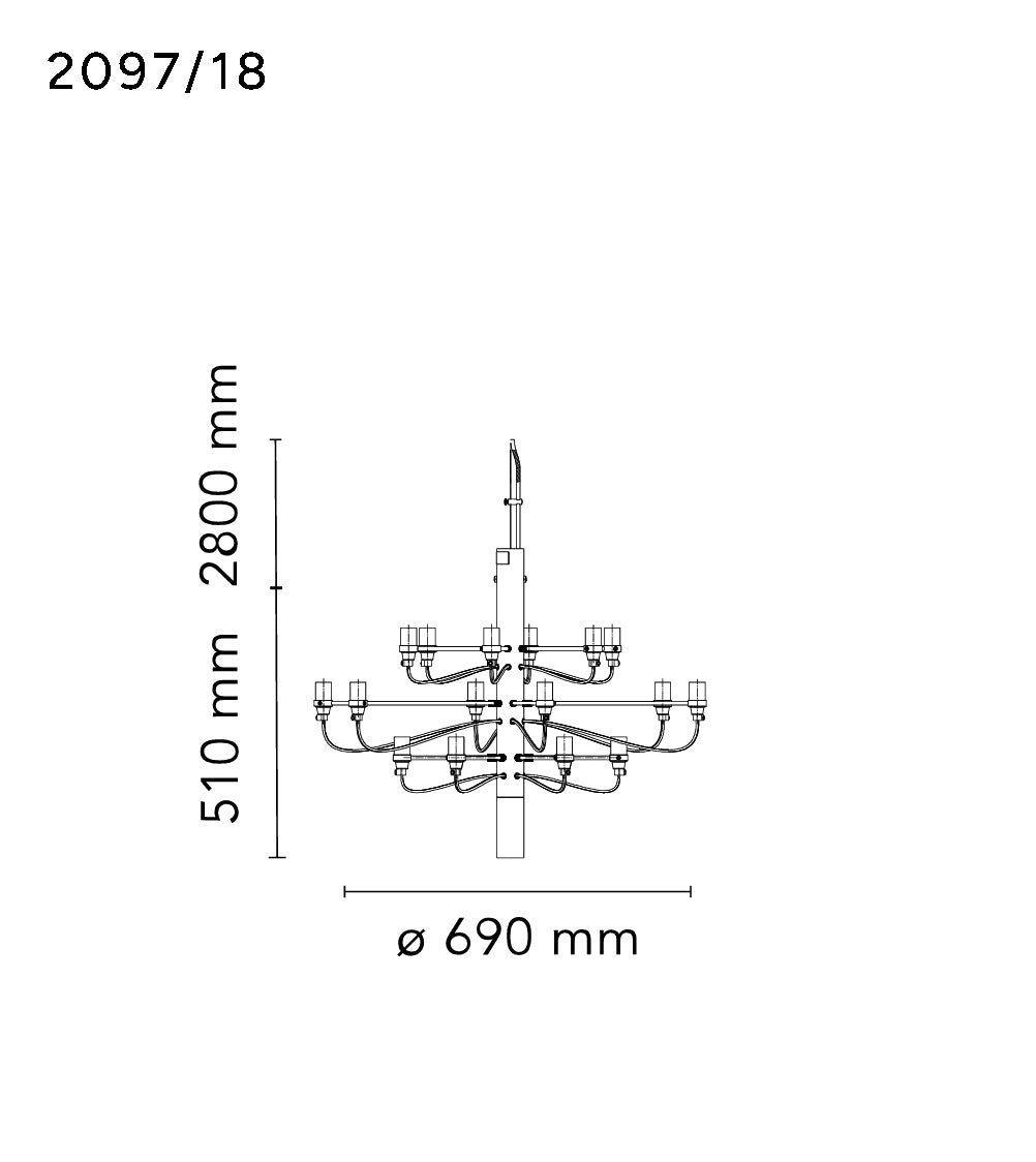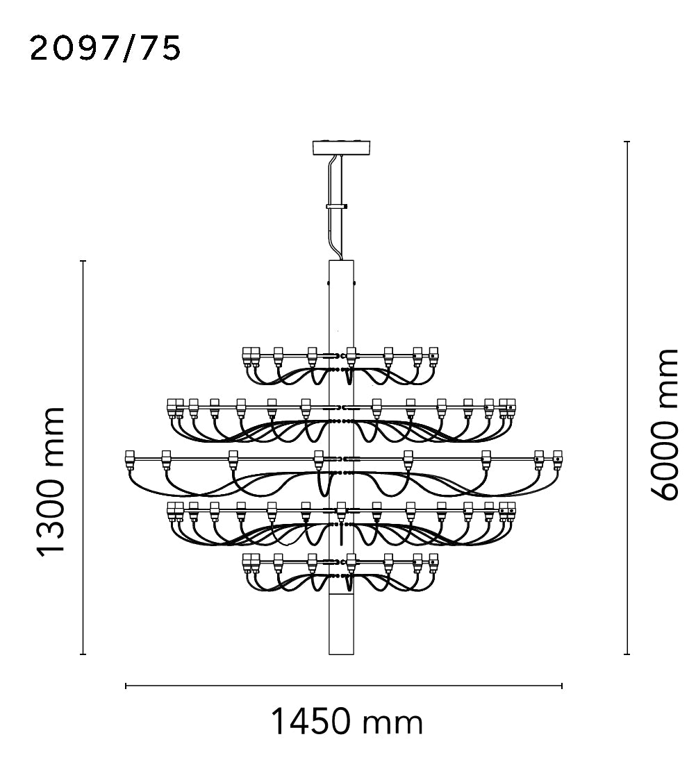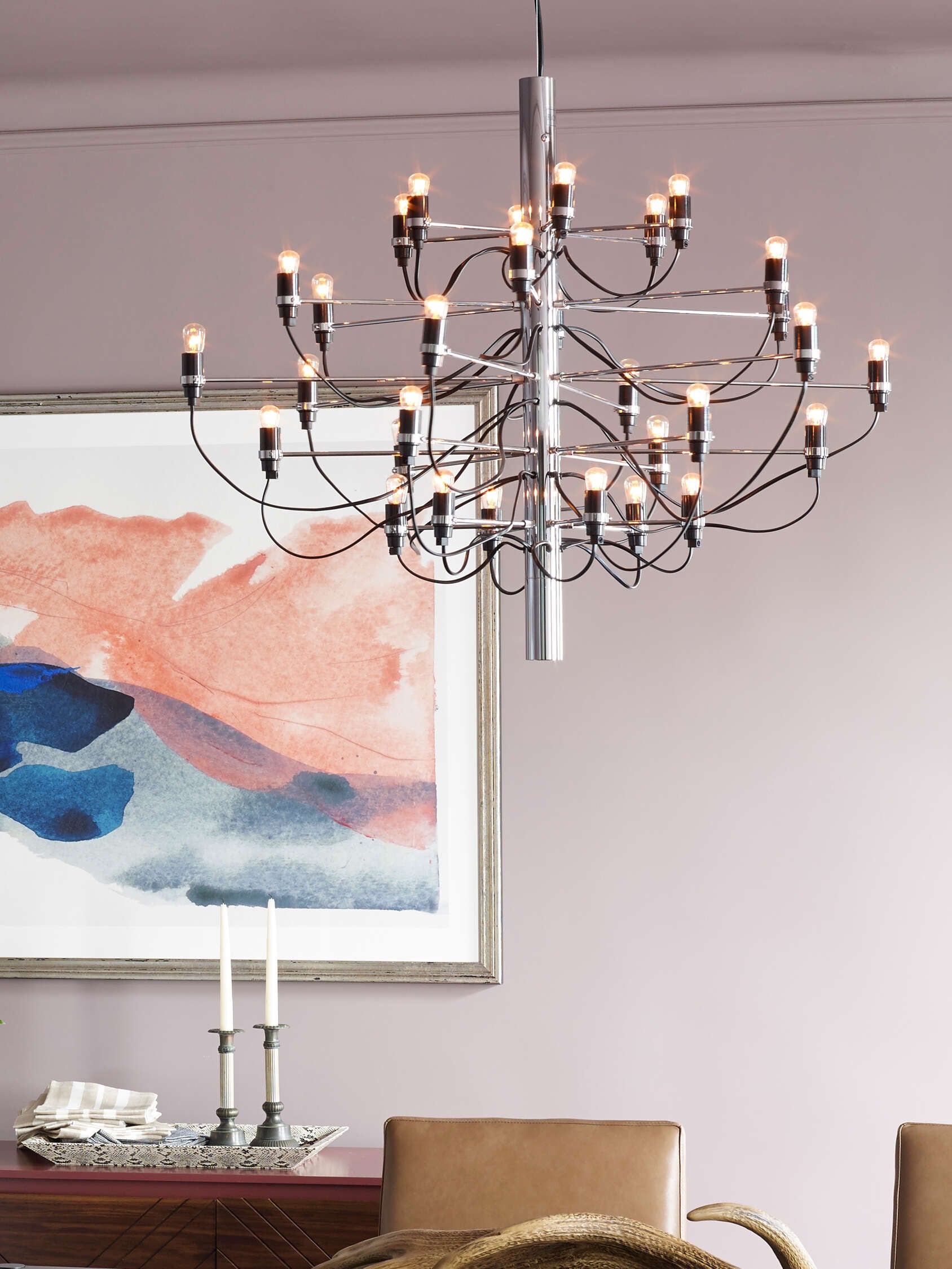 Sus múltiples brazos en disposición radial sostienen bombillas expuestas que proyectan una luz cálida y envolvente, creando una atmósfera sofisticada. Disponible en acabados de alta calidad, como cromo o latón, la 2097 es perfecta para espacios residenciales o comerciales que buscan destacar con un diseño atrevido y atemporal.