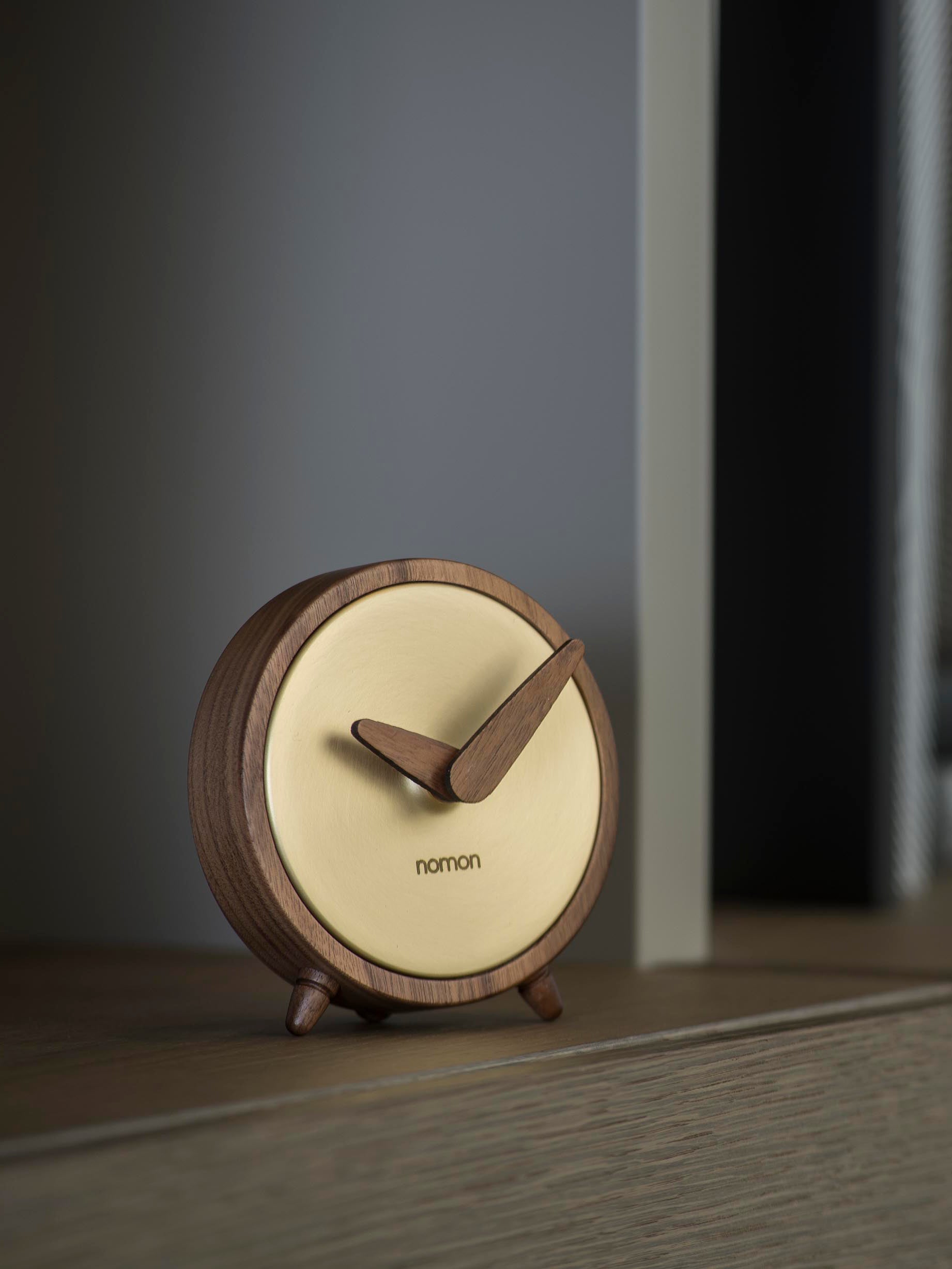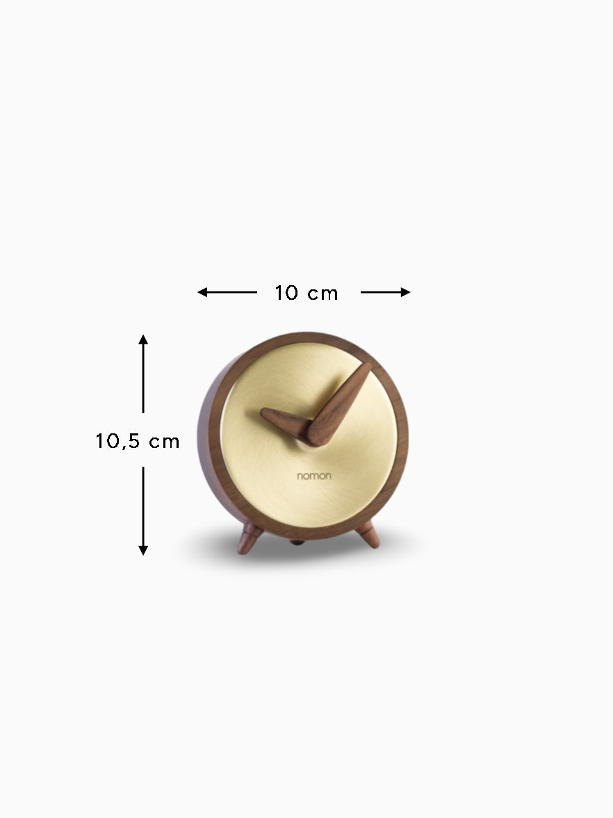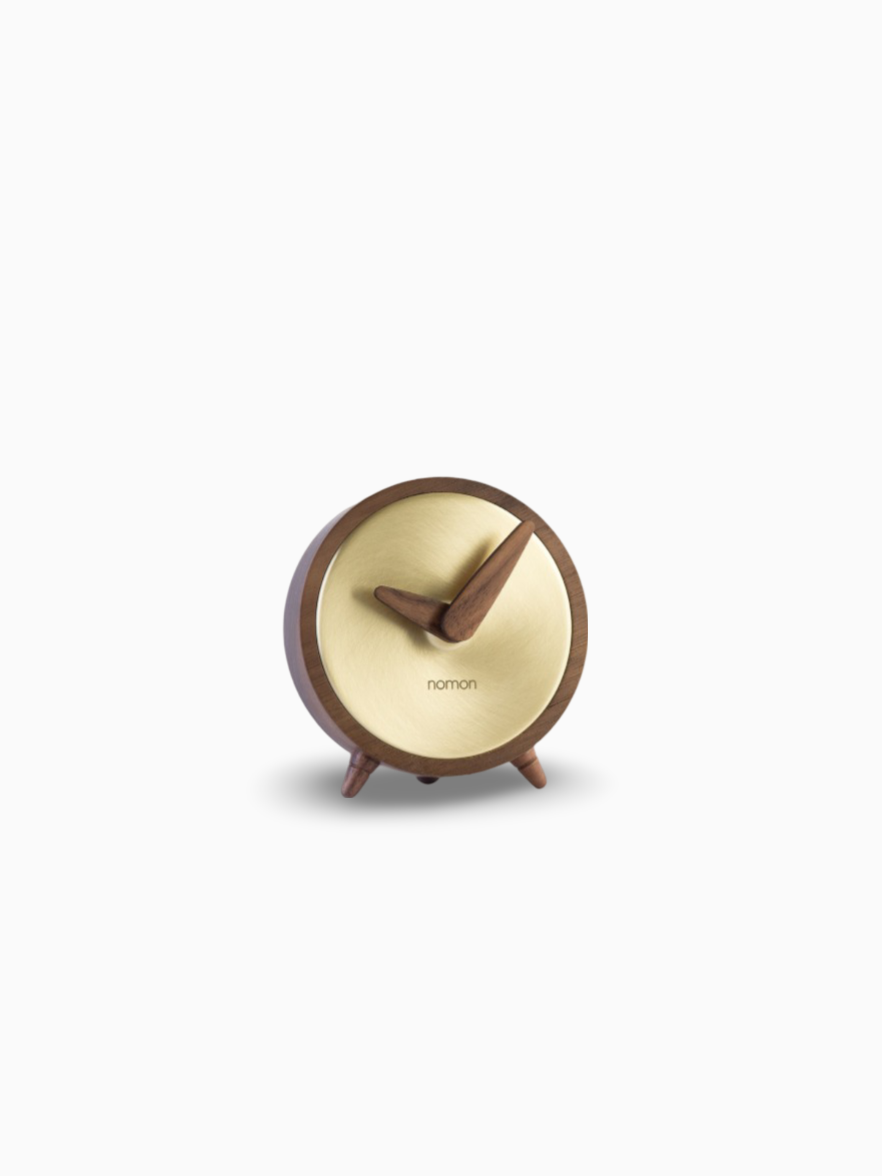 El reloj de sobremesa Átomo de Nomon es una joya del diseño contemporáneo que combina artesanía de alta calidad con una estética sofisticada. Fabricado con madera de nogal natural y detalles en latón pulido, este reloj destaca por su refinamiento y funcionalidad. Sus agujas, también elaboradas en madera de nogal, aportan un toque cálido y elegante que complementa cualquier espacio.