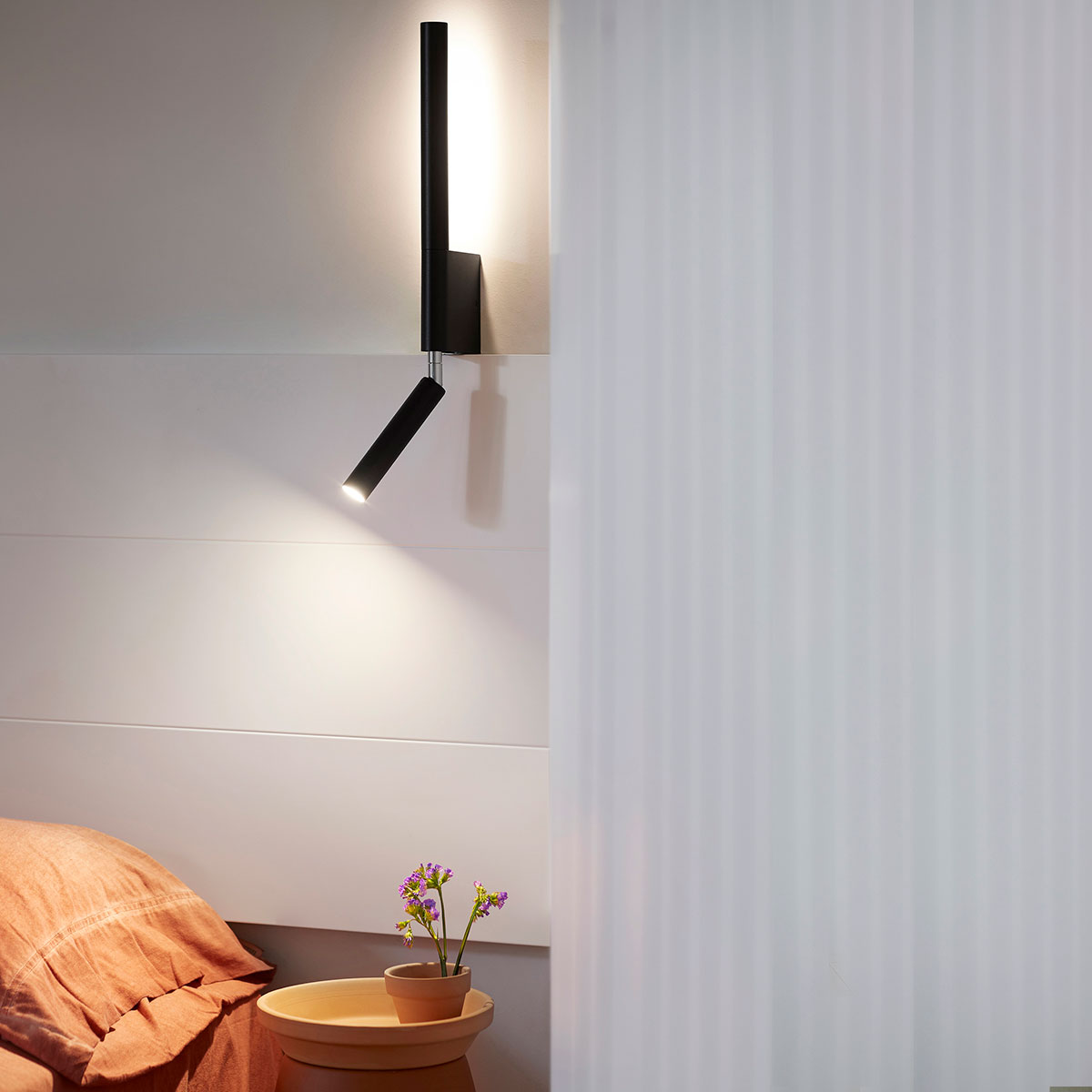 El aplique de pared CANUT de Estiluz combina elegancia y funcionalidad en un diseño lineal y discreto, ideal para dormitorios y espacios de lectura. Su estructura incluye un brazo fijo que emite luz indirecta, creando un ambiente acogedor, y un brazo de lectura orientable con luz directa, perfecto para disfrutar de una iluminación precisa sin molestias.